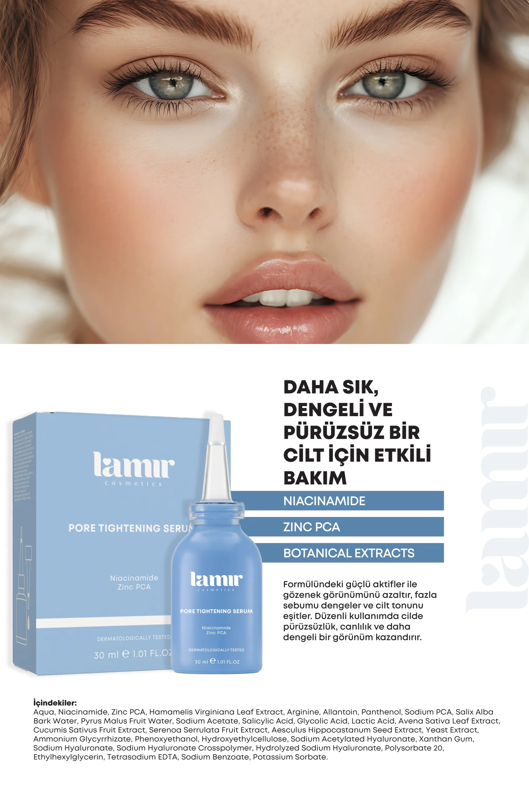 - Niacinamide (Vitamin B3)→ Gözenek görünümünü azaltır, cilt tonunu eşitler.